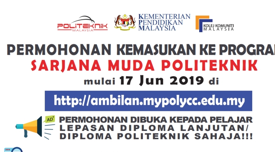 Calon-calon lepasan Diploma Lanjutan/ Diploma Politeknik dipelawa untuk mengemukakan permohonan ke program Sarjana Muda Politeknik untuk Sesi September 2019. Borang permohonan dibuka secara atas talian mulai mulai 17 Jun 2019. Permohonan adalah percuma (tanpa no Unik ID).