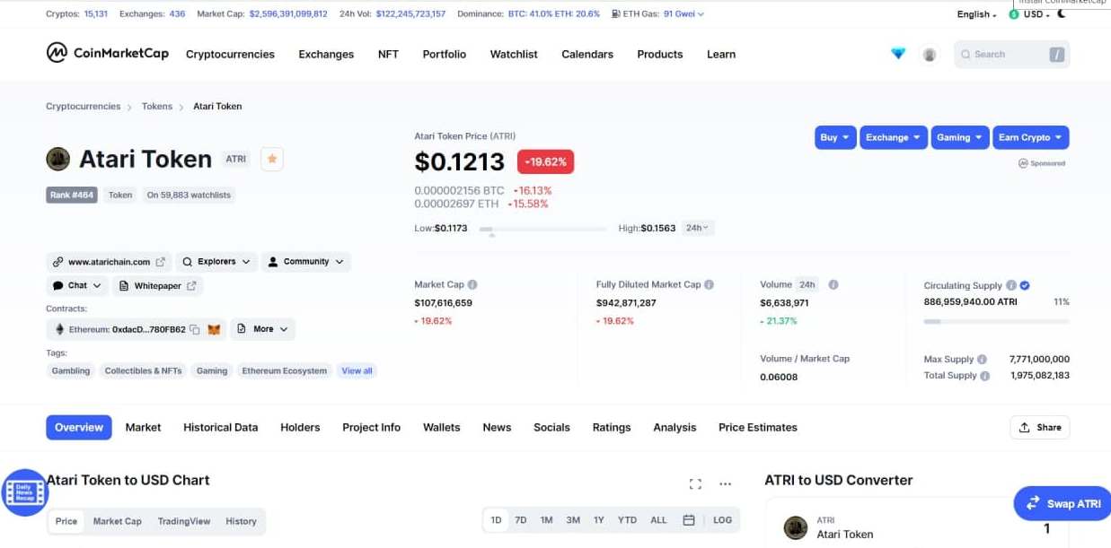The live Atari Token price today is $0.123783 USD with a 24-hour trading volume of $6,643,408 USD. We update our ATRI to USD price in real-time. Atari Token is down 18.89% in the last 24 hours. The current CoinMarketCap ranking is #471, with a live market cap of $109,790,180 USD. It has a circulating supply of 886,959,940 ATRI coins and a max. supply of 7,771,000,000 ATRI coins.